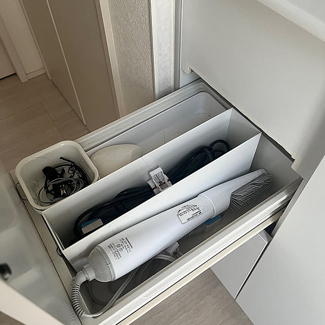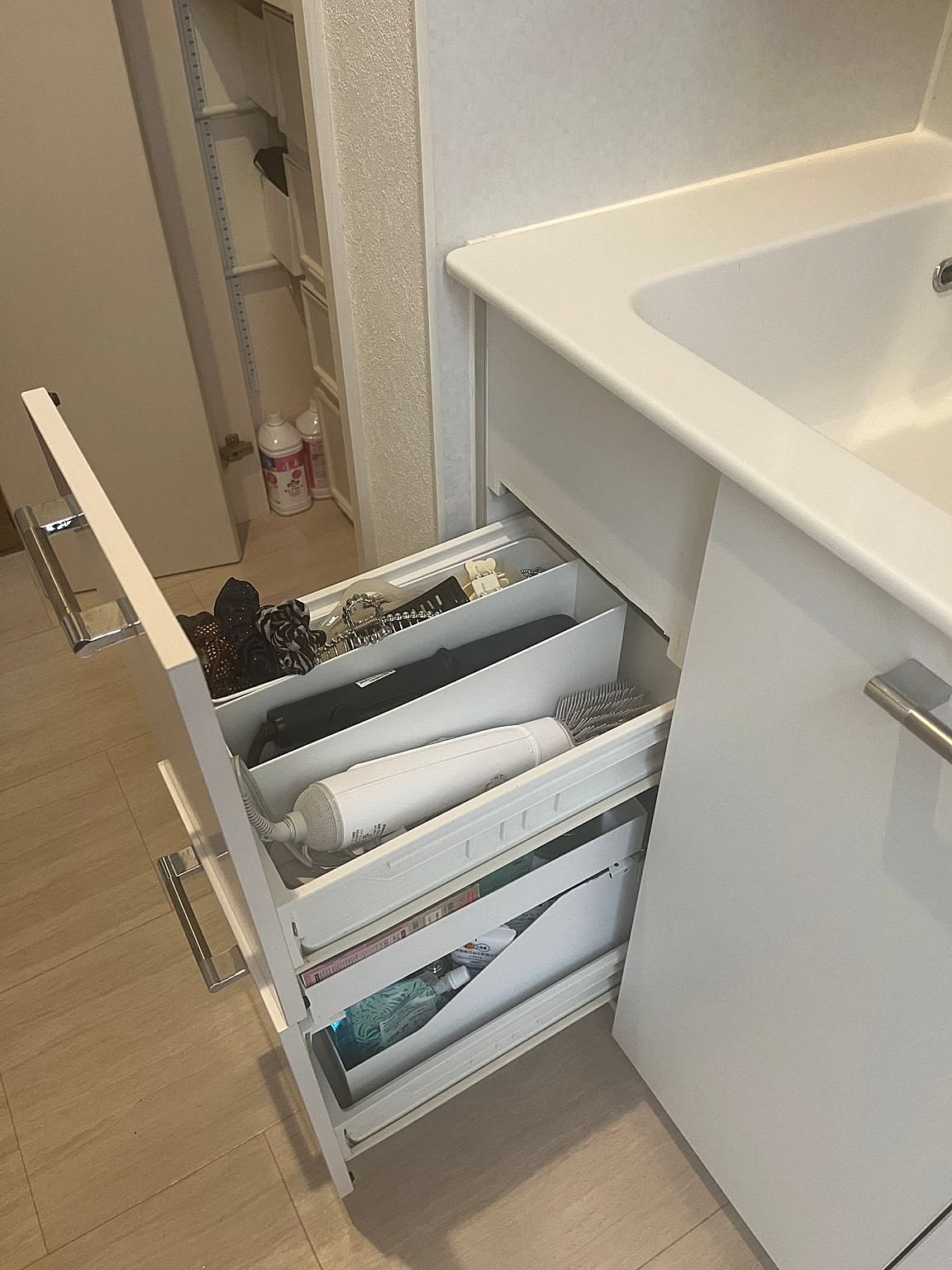 「洗面台の引き出しは、上段の深さは浅く、下段は深さがあり過ぎと、そのままでは使い勝手が悪かったんです。そこで、上段にはニトリの収納ケースで仕切りをつくり、ドライヤーをそのまま入れられるようにしました。さらに下段には、ファイルボックスを少し加工して組み合わせ、深さありすぎ問題を解決しました。」