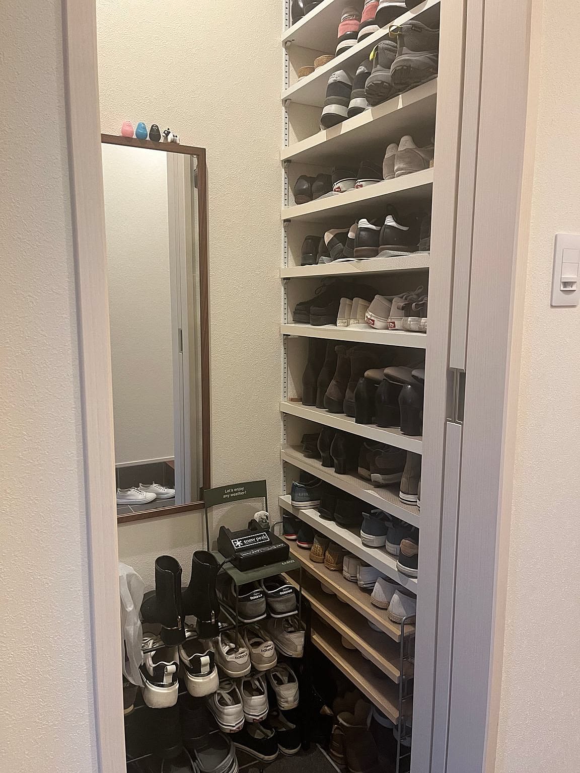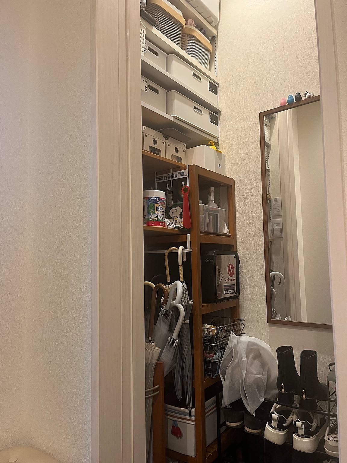 「シューズクロークは、高さが天井まであります。一方で、約1畳とちょっと手狭。工夫して靴収納に十分な棚を確保しています。また、高さを活かして、靴収納の反対側には、傘や工具、季節もの、寝袋、非常持ち出し袋といったものを収納しています。」