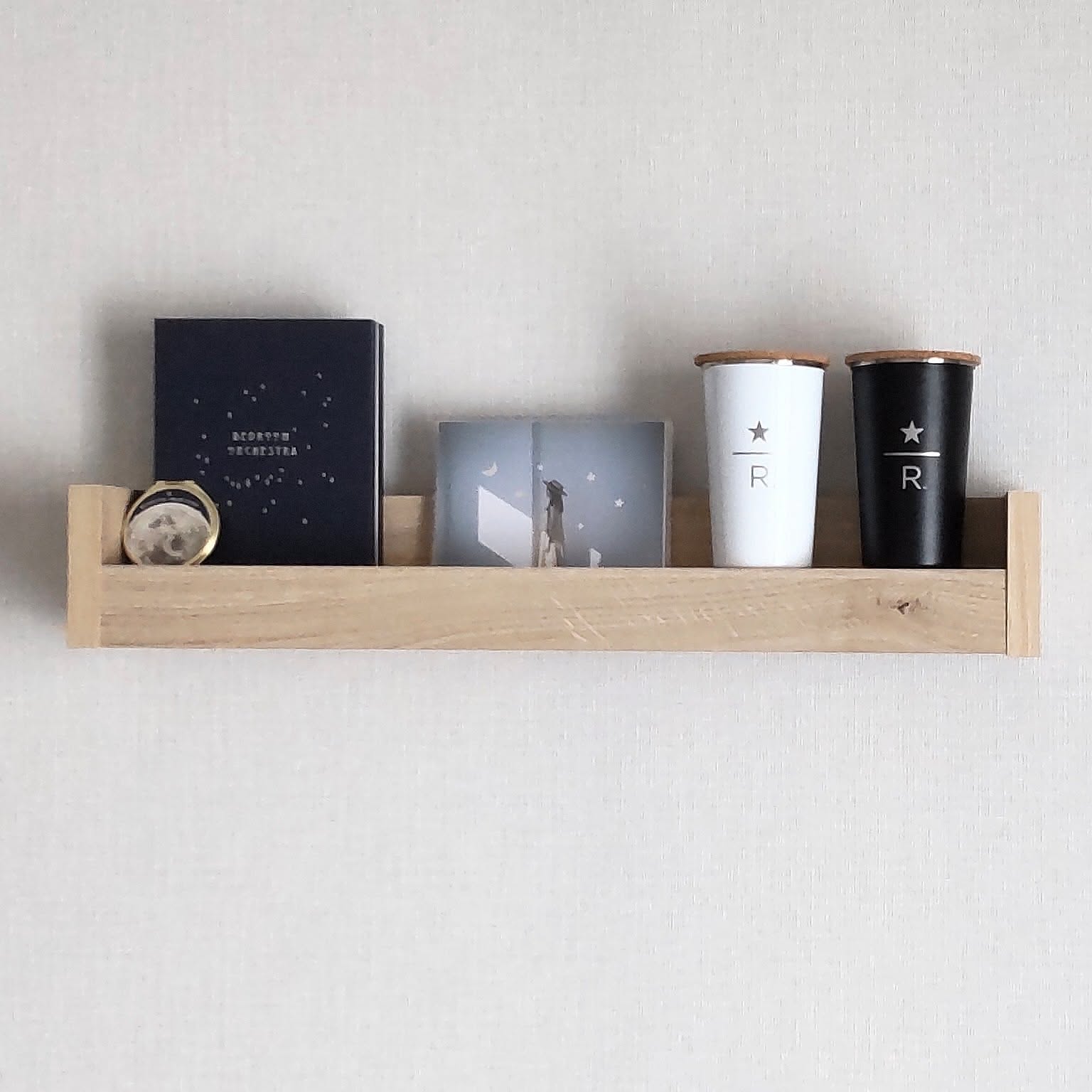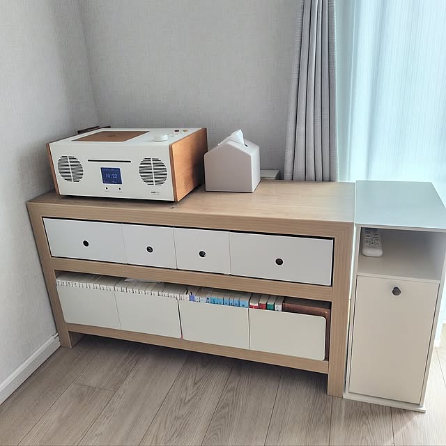 「写真の収納棚は、arneというショップで1cm単位でオーダーしたものです。ちなみにサイズは、W89×D32×H50cm。上段の高さは13cm、下段は18cmとかなり細かく指定しました。上段には無印良品のボックスが4つ、下段には文庫本が丁度よく収まります。文庫本の背表紙がカラフルなので、DAISOのブックエンドで目隠ししています。」