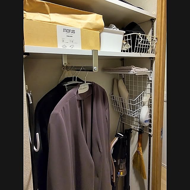 穴なし・釘なしで、棚板を挟むようにして設置するだけで、ハンガーバーになります。シューズクローゼットの中にコートを掛けられる場所をつくりたいと考えていたとき、この商品を見つけて『これだ!』と思いました。