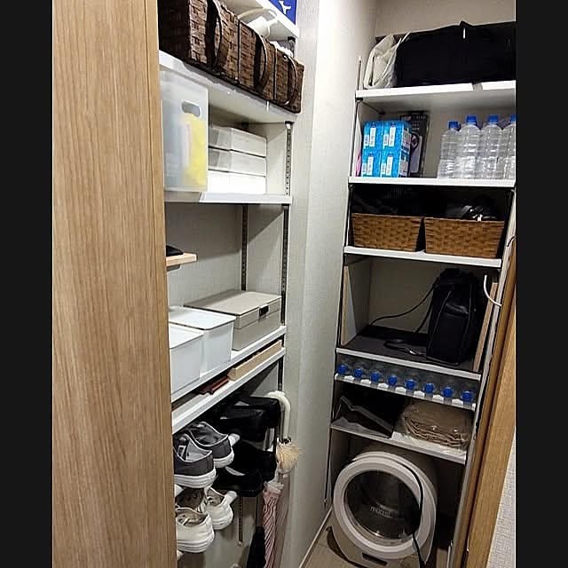 「写真左にある可動棚の棚を、上の方に集中させてみたんです。広く空いた下の部分には、つっぱり棒を2本かけて、靴と傘を並べられるようにアレンジ。上に集中させた分、幅の狭い段が生まれるのですが、これが案外細かいものの収納に向いていて便利なんです。」