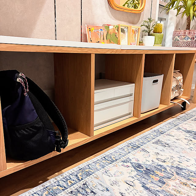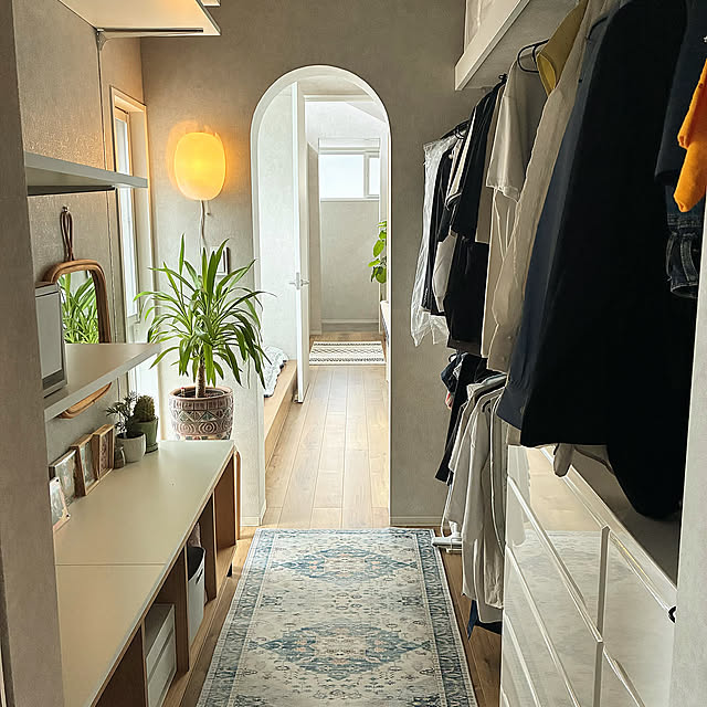 そして、家族の日常のメイン動線だからこそ、ウォークスルークローゼットの中のインテリアにもこだわったとpopoさん。間接照明やカーペット、カラーコーディネートといったところに、LDKのスタイリングとのリンクが感じられるから、ひと部屋としてもとても魅力的な仕上がりです。ランドセルなどの収納棚が、なんとなくローテーブルのようにも見えてくるのがおしゃれ。片付けながら、遊びがはじまるなんてこともあるかもしれません。ここには、開放感とおこもり感の両方があるので、ちょっとワクワクもしそうです。