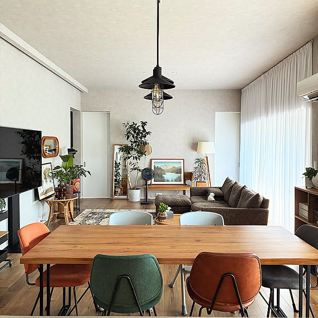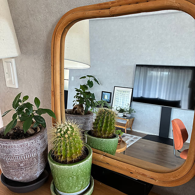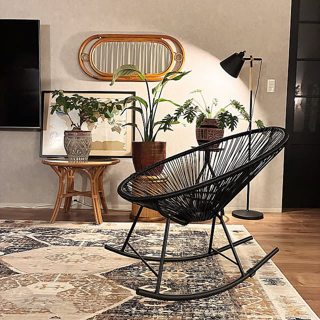 観葉植物と間接照明、ラタン家具が好きで、そうした要素を詰め込んだ空間になっています。インテリアで意識していることは、色を合わせることです。