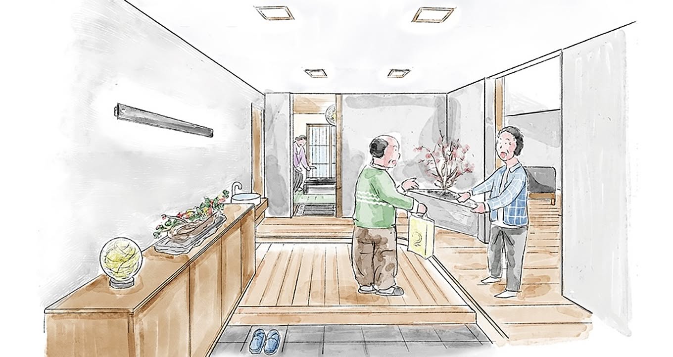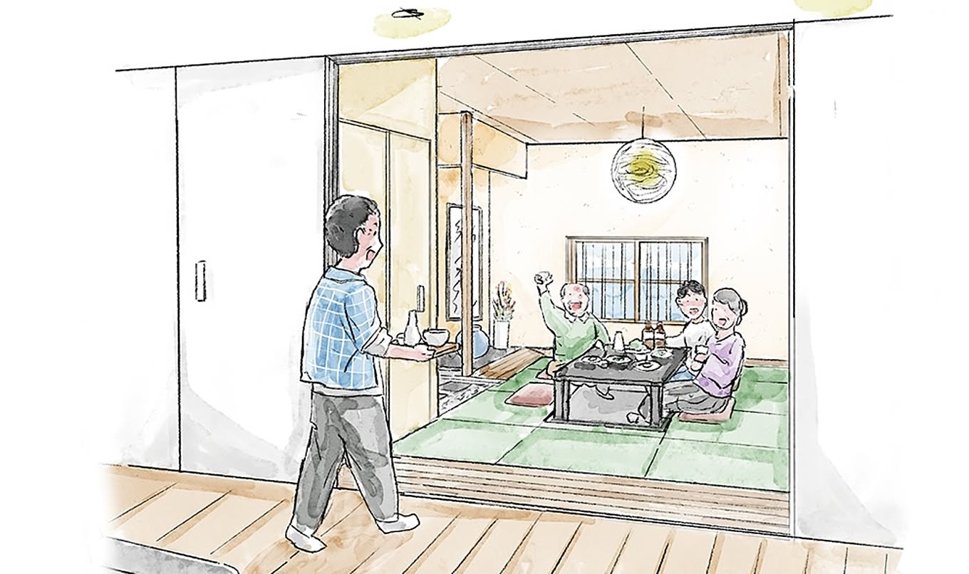 元々の和室を縮小して、玄関を広々とした和テイストの空間に。和室とリビングの間の引き戸を開けると、大人数でも安心のスペースを確保できます。掘りごたつでくつろぎながら、苔庭を眺められる和室はまるで料亭のよう!みんなでのんびりお料理を楽しむ、ステキな時間が過ごせそうですね。