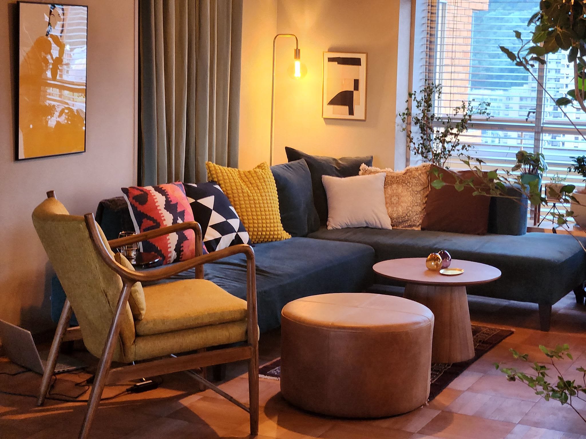 moo56co6さん宅は、インテリアショップのような、バーのような、コンドミニアムのような、贅沢なリラックス感が充満しています。おしゃれでありつつも、気さくに大らかに受け入れてくれる懐の深さを感じられるのも素敵なところ。今回ご紹介いただく愛用品は、そんな空間にあるソファの上に並べられています。いくつかクッションがありますが、注目するのは深みとあたたかみのあるオレンジベースのキリム柄のそれ。まずは、お気に入りの理由から教えてください。