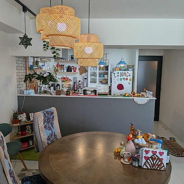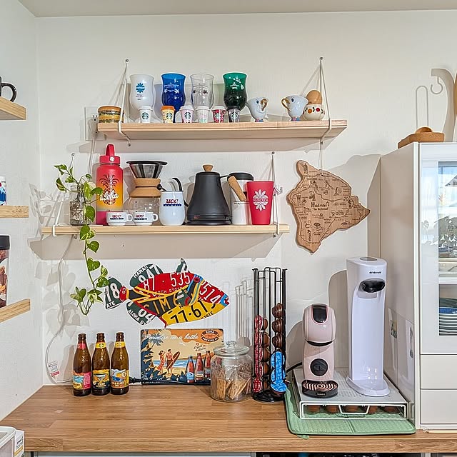 ダイニングの奥に見えるオープンなキッチンは、たくさんの雑貨で飾られています。あるのはご夫婦ともに愛してやまない『ハワイ島』の色々。旅をするたびに増えていくお気に入りたちがこうして並ぶと、もうご夫婦の大好きがギュッと詰まったみやげ物屋さんです♡ご夫婦が日々楽しいだけでなく、訪れた人たちも旅先から持ち帰る宝物を選ぶ時みたいなワクワク感を味わっているに違いありません。