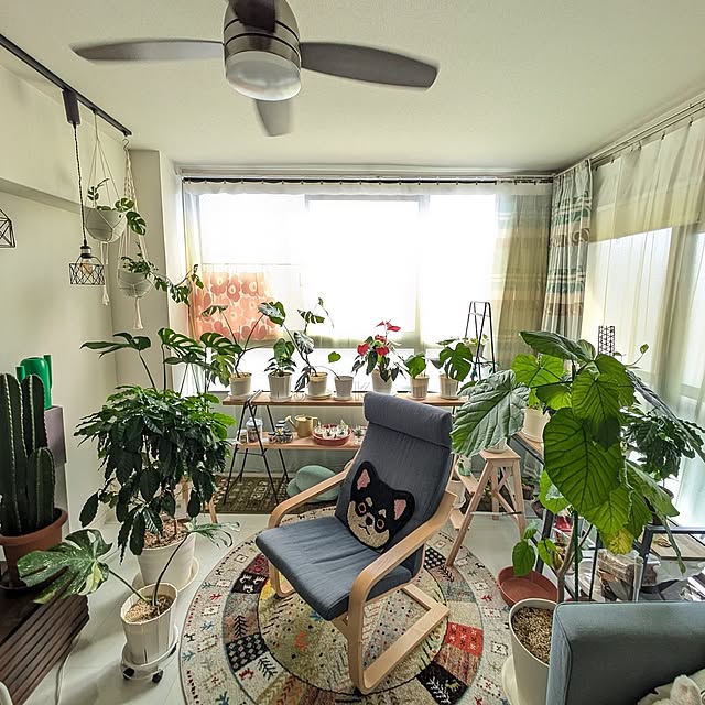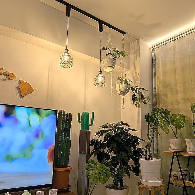 SwitchBotのカーテン3とサーキュレーターです。留守にすることも多いので、カーテンがタイマー開閉できるのはすごく便利。植物に欠かせない風をサーキュレーターで24時間管理できるのもやはり便利です。コンセントから電源の取れるダクトレールは、どこでもペンダントライトが設置できてしまう優れものなので、こちらも買ってよかったもののひとつですね。