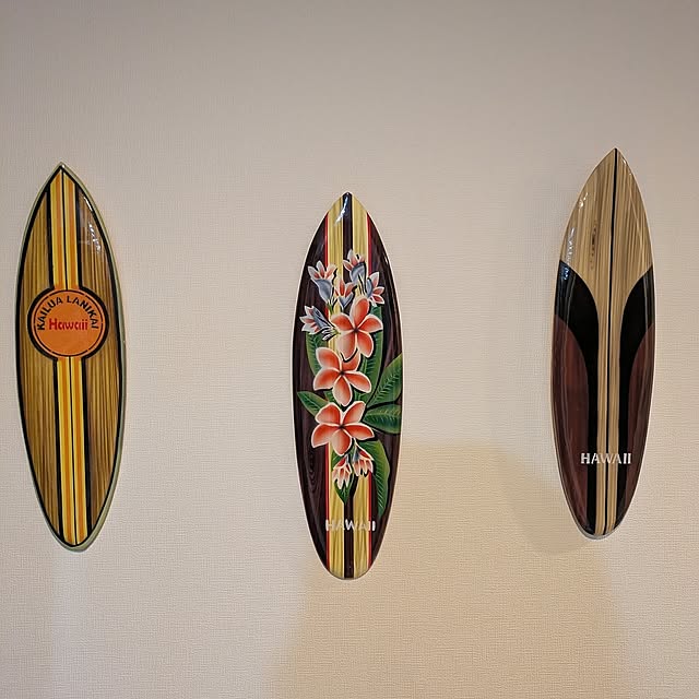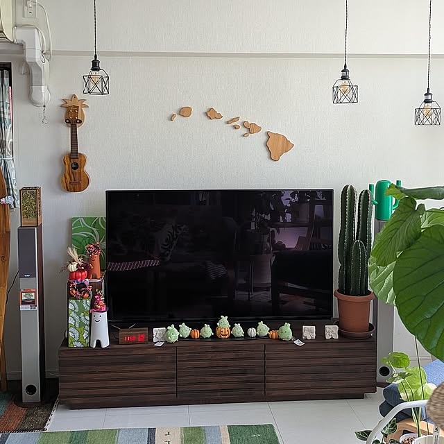 リビングのテレビの上には、ハワイの地図もありますね♪ウクレレや植物たちが、南の島の陽気な雰囲気を盛り上げているよう。そしてそんなハワイアンなエッセンスの中に、北欧の穏やかでシンプルな造形を散りばめるのがkolo92さんオリジナルの『北欧ハワイアン』スタイルです。