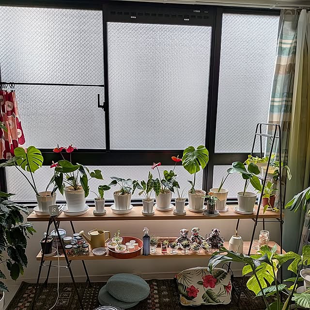 リビングの横につくられたグリーンスペースは、北欧とハワイアンの融合が特に際立つリラックス空間。形板ガラスの窓から注ぐ柔らかい日差しと共に楽しむ、ゆったりとした時間がお気に入りだとkolo92さんは語ります。