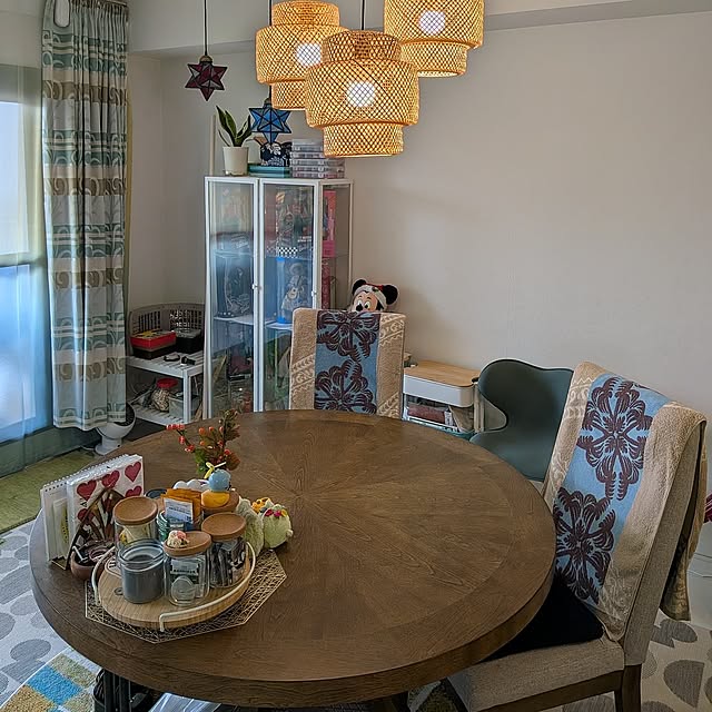 『Waikiki→』の文字に誘われた先には、LDKがありました。ハワイっぽさのある円卓、ファブリック、そして開放感が、旅に来たような心地よいリラックス感を与えてくれる素敵な空間です。