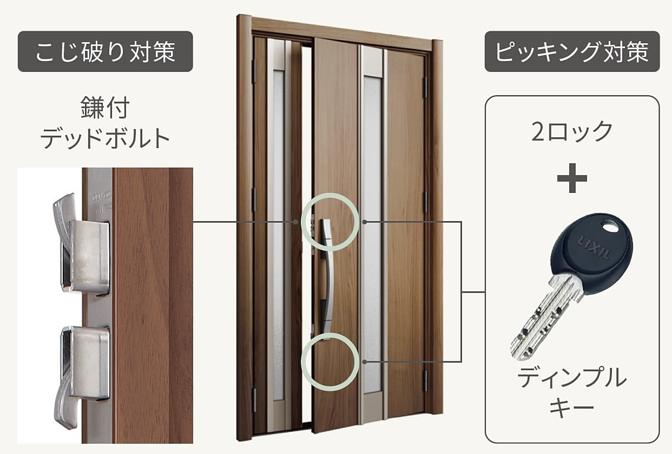 「リシェント玄関ドア3」には室内側・室外側の両方に、防犯性を向上させるための機能が揃っています。不正解錠しづらい構造のシリンダーを採用している上に「2ロック」を標準装備し、泥棒から狙われにくい仕様に。さらに鎌付デッドボルトで扉と枠の噛み合わせが強化され、「こじ破り」に対する抵抗力もアップ!カギ穴を隠せる「S型ハンドル(選択品)」を選べば、シリンダーがカバーで覆われているためカギ穴が見つけづらく、ピッキング対策としてさらに効果的です。カギには表面に多数のくぼみが付いた複製困難な「ディンプルキー」を採用しているため、同じくピッキングに強い構造です。
