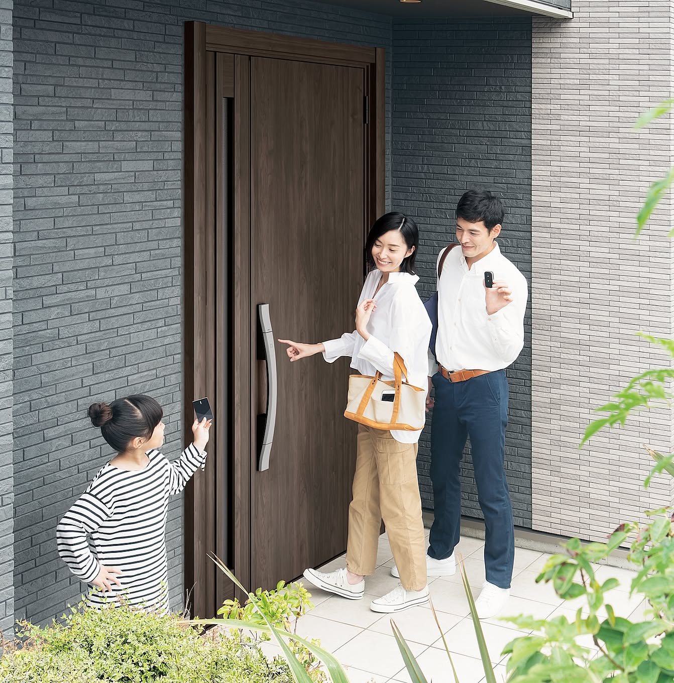 「FamiLock」は、スマートフォンやリモコン、カードキー、タグキーを使用して玄関ドアの施解錠を行うシステムです。スマートフォンをバッグやポケットに入れておけば、ドアのボタンを押すだけでカギの開け閉めが可能に!家族一人ひとりにとって使いやすいカギを選ぶことができますよ。専用アプリを使用すれば、外出先で操作履歴を確認したり、家族が施解錠した際に通知を受け取ったりできます※1。また、LIXILのIoTホームLink「Life Assist2」と「FamiLock」を連携させることで※2、遠隔からの施解錠の操作※3や、施解錠の状態の確認が可能になります。