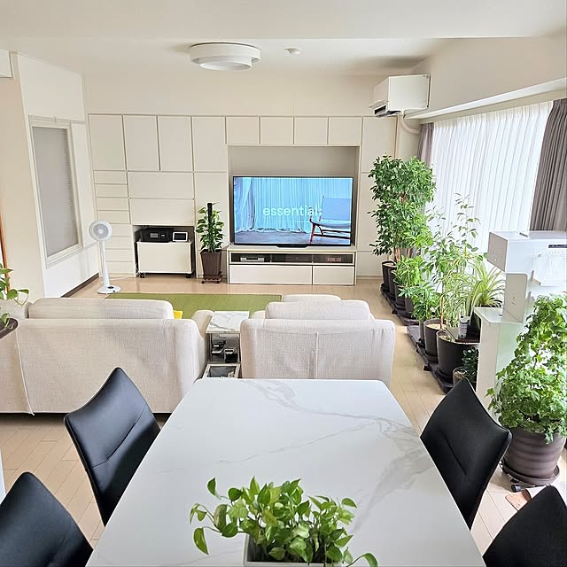 白を基調にしたリビングダイニングに、観葉植物や季節の花がそっと彩りを添えるお部屋です。住み慣れたマンションをリフォームし、生活感を隠しながら、テーブルや床には物を置かないことですっきりとした景色をキープ。片付けや模様替えを楽しむ様子から、穏やかで丁寧な暮らしぶりが伝わってきます。