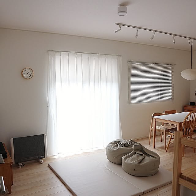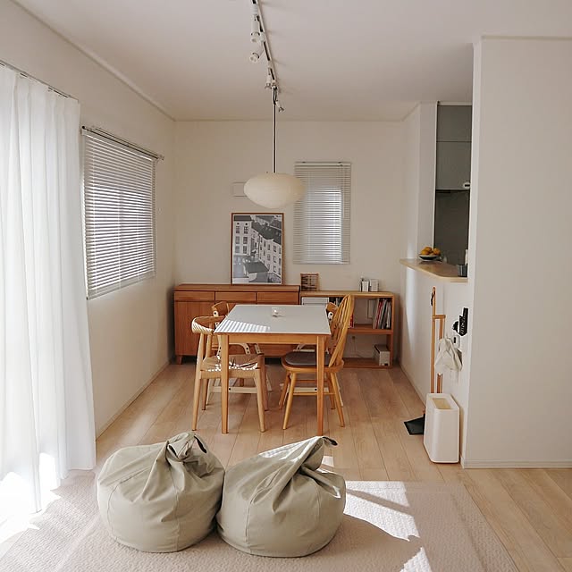 4LDKの新築戸建てを一部リフォームし、白と明るい木目を基調にしたナチュラルなインテリアで整えたaya_blueさん。ご夫婦とお子さん2人が過ごすリビングには、ビーズクッションやプレイマットを取り入れ、くつろげる空間づくりと掃除のしやすさを両立されています。飾るものを厳選し、動線や家事のしやすさを意識した収納見直しを続けている様子から、丁寧で前向きな暮らしぶりが伝わってきますね。