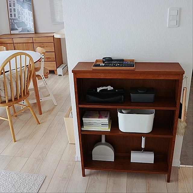 リビングからキッチン、洗面所へと続く動線上には、奥行きの浅い棚を設置。限られたスペースに頻繁に使うものだけを集めた定位置をつくっています。以前はカゴにまとめていた掃除道具も、あえてそのまま置く仕組みに変え、出し入れの手間を減らしたのもポイント。シンプルで家族にもわかりやすいオープン収納になっています。生活に合わせてルールを柔らかく変えていく姿勢に、丁寧な工夫が感じられますね。