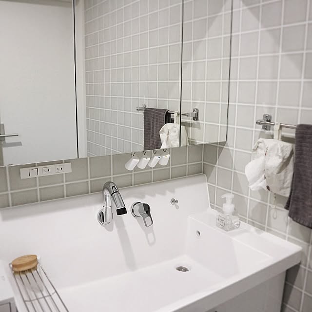 洗面所のコップ収納は、100円ショップのアイテムを駆使したDIY。セリア「ステンレスものさし15cm」にセリア/ダイソー「超強粘着両面ゲルテープ」で固定し、セリア「強力ネオジム磁石スチールフック」をプラス。そこにセリア「水切れがいいマウスウォッシュ用コップ」を引っ掛けることで、“浮かせるコップ収納”を実現しています。清潔を保ちやすく、真似しやすい工夫がとても参考になります。