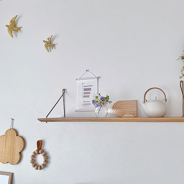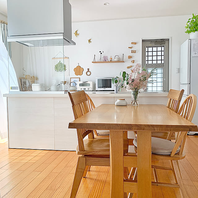 キッチン周りのものを“見せる収納”で心地よくまとめているのも、koko_hikaさんのセンスを感じます。調理道具やお気に入りの食器をすっきり見せつつ、手に取りやすい高さに置くことで、実用性もちゃんとキープ。木の素材感がキッチンのインテリアともマッチし、置くだけで温かい雰囲気をつくりだしています。