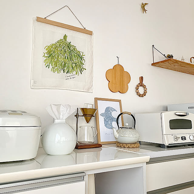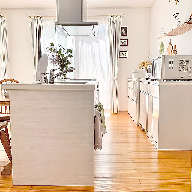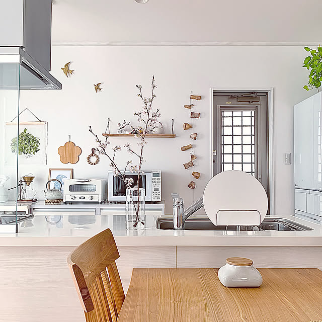 koko_hikaさんのお宅のキッチンは、白を基調に木の温もりが加わった明るい空間が印象的ですね。 日々の調理や家事がスムーズに進むよう、背面やカウンターまわりをすっきりと整え、 お気に入りの雑貨や家電をほどよく配置。暮らしの「ちょうどいい心地よさ」を大切に、 丁寧に手を加えながら楽しんでいる様子が伝わってきます。