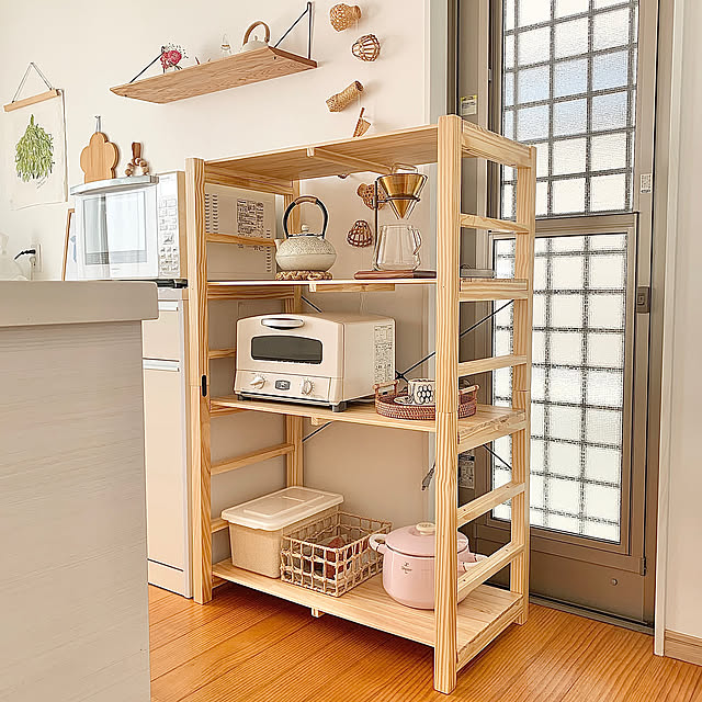 「キッチン用品を収納してみました。天然パイン材のラックで、ナチュラルな雰囲気のキッチンになりました。」