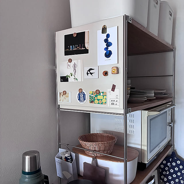 sakiさんのキッチンは、実用的でありながら遊び心のあるインテリアも魅力です。食器棚のサイドに並ぶのは、ポストカードやショップカード、旅先で集めたマグネットたち。何気なく目に入る場所だからこそ、思い出やお気に入りが日常に溶け込み、家事の時間も楽しいものに。実用性の中に、sakiさんらしさがさりげなく感じられる一角です。