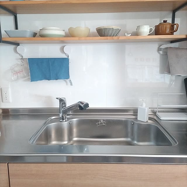 シンクに付属していたカゴをあえて外し、シンプルなステンレスシンクの面を見せる工夫がされています。凹凸が減ることで水あかや汚れが溜まりにくくなり、掃除のしやすさもぐっとアップ。清潔感のあるすっきりとした印象のキッチンに整っています。洗剤ボトルも白を選ぶことで、見た目のノイズを抑えながら、美しく保ちやすい環境づくりをされているのが伝わってきますね。