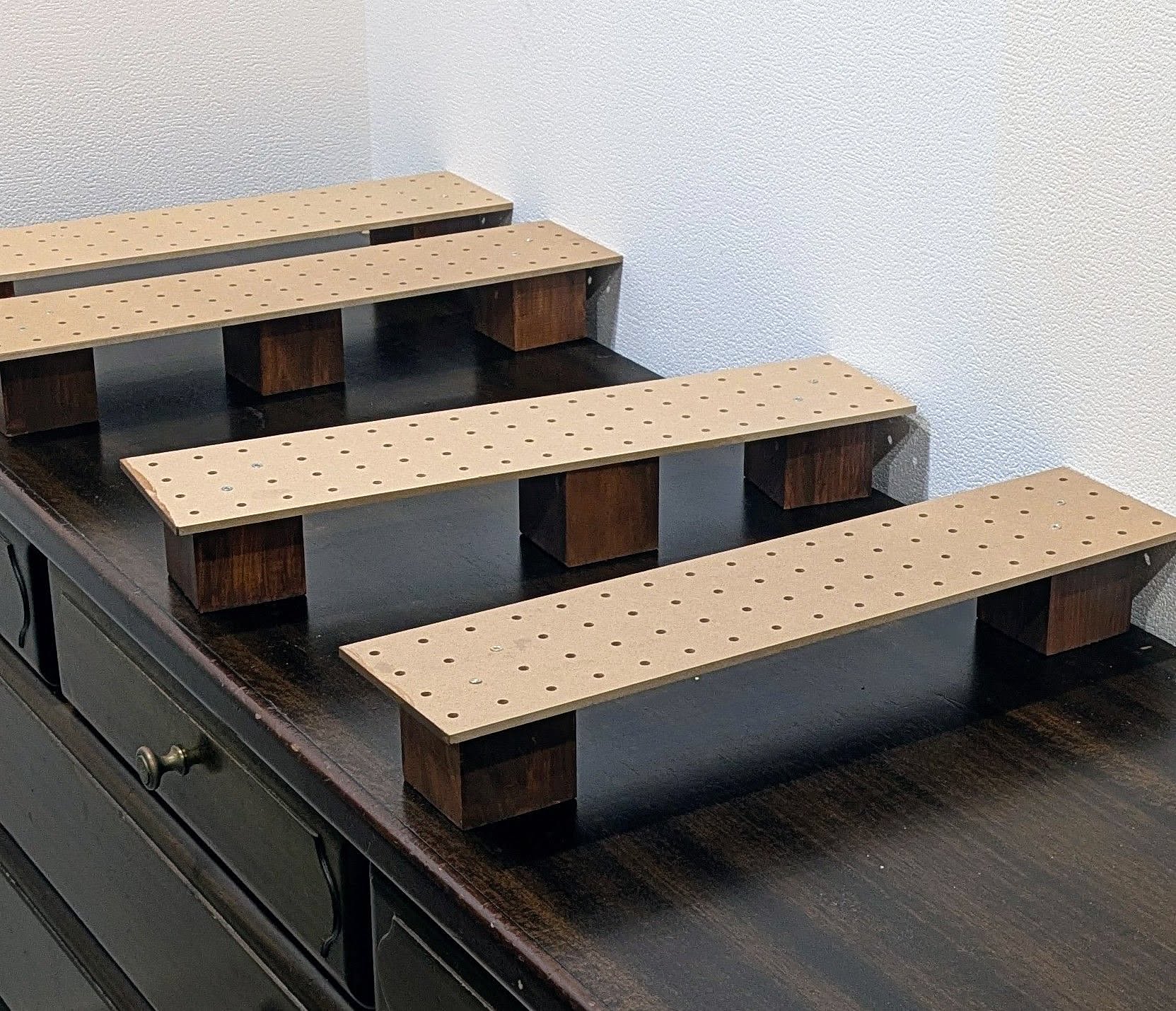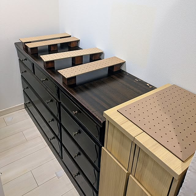 ケヤキ角材を1個ずつ両端にくるように置き、その上にMDFパンチングボードを乗せて固定します。パンチングボードの穴からネジ止めしていますが、あとで使うズレ防止テープや両面テープでもOKです。 ※材料の角材は2個余ります。