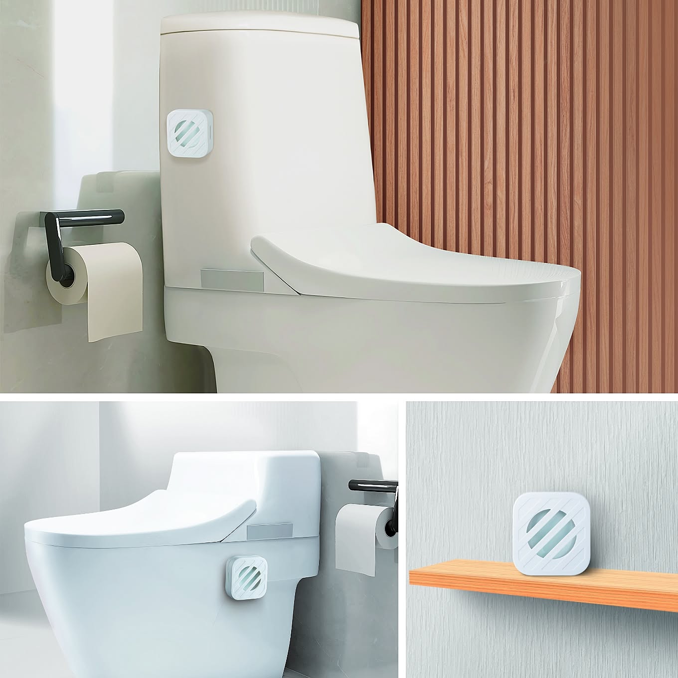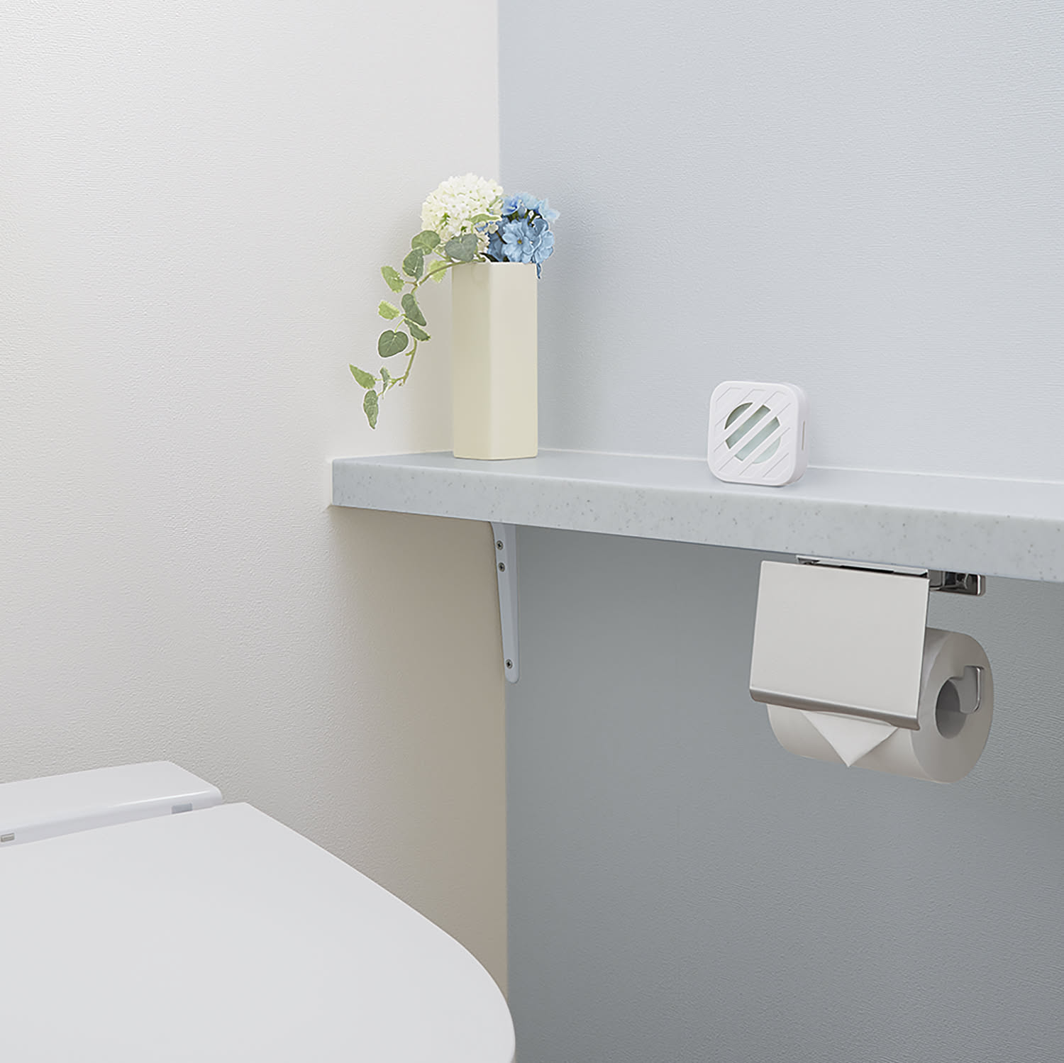 「そのまま棚などに置いて設置するのはもちろん、付属の粘着タブ付き専用フックでトイレタンクや便器などに貼り付けて、浮かせて設置することもできます。薄型コンパクトサイズだからどんなトイレ空間にもなじみ、インテリアを邪魔することもありません。生活感が出にくく、床掃除もしやすいんです!」