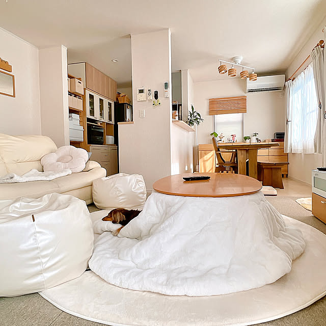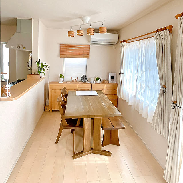 木の温もりを感じるナチュラルなインテリアを軸に、家族と愛犬がゆったり過ごせる空間を整えているrinoさん。リビングやダイニング、キッチンには、余白を大切にした配置や、色味をそろえた収納アイテムが取り入れられ、すっきりとした印象にまとまっています。必要なものが自然と収まるよう整えられた空間からは、日々の暮らしを心地よく保とうとする気持ちが伝わってきます。見た目のやさしさと暮らしやすさを両立している様子が印象的ですね。
