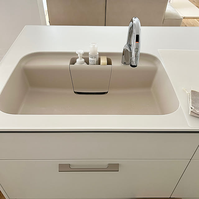 シンク内のスポンジ置き場に洗剤ボトルやハンドソープもまとめて置くことで、日々の手洗い・食器洗い動作が自然に整っていて、清潔感が伝わってきます。元々のスポンジ置きが使いやすいからこそ、洗剤ボトルも同じ場所に収まり、散らかることなく「見せる収納」になっていますね。いつもの場所がきちんと決まっているだけで、シンクまわりがすっきり見え、気持ちも軽くなる工夫です。
