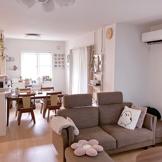 木のぬくもりを感じる家具と、白を基調とした明るい空間づくりが印象的なyuukiさん宅。リビングダイニングは家具でゆるやかに仕切られたレイアウトで、キッチンも素材や色味をそろえて統一感を大切にされています。整った印象の中にもやわらかさがあり、日々を心地よく過ごすための工夫が感じられるお住まいですね。