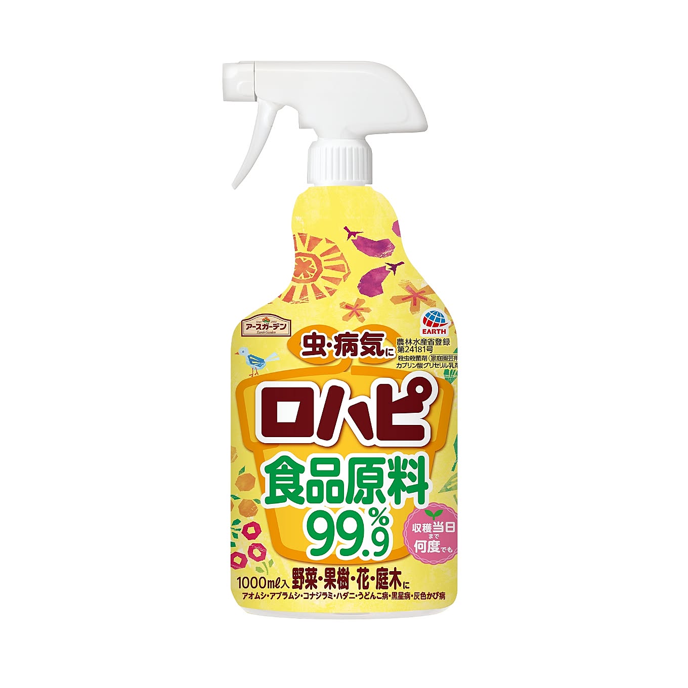 「食品原料99.9%の殺虫殺菌スプレーです。有効成分はココナッツオイル由来成分で、アイスクリームやお惣菜などの食品の日持ち向上剤としても使われているもの。使用回数に制限はなく、収穫当日まで何度でもお使いいただけます。特有のイヤなニオイがなく、室内栽培の観葉植物などにもぴったり。厄介なハダニ、アオムシなどに効き、バラの黒星病の予防にも効果的※ですよ!」