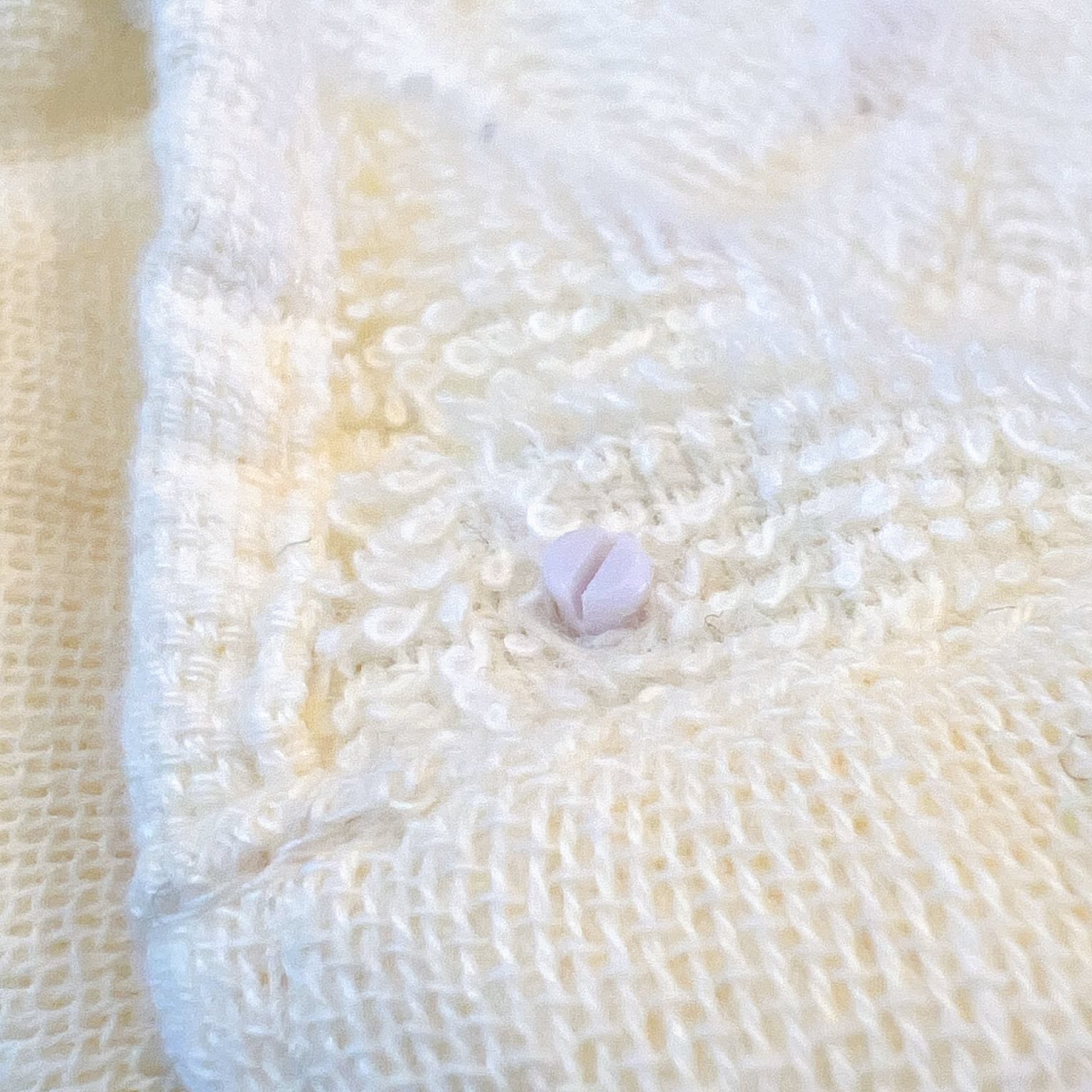ハンドタオルを抱っこひもの着けたい箇所に合わせて当て、樹脂ホックを留める位置を決めます。位置が決まったら、楊枝で穴を開けます。