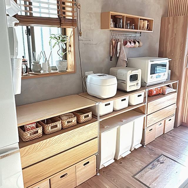 puu.tuuliさんのキッチンがいつもスッキリ見える秘密、それは収納の「比率」にありました。生活感の出やすいストック類は、白いボックスやバスケットに収めて徹底的に「隠す」。一方で、お気に入りのマグカップなどはディスプレイ感覚で「魅せる」。この絶妙なバランスが、整った印象と温かみを両立させているのですね。