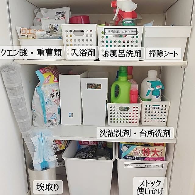 「因みに夫は洗剤マニアで洗剤大好き(笑)気がつくと使っていないものも、タブって買ってるものもあり、必要が無いものは処分しました。たまの見直し大切ですね。扉は付いていますが、奥が深いので埃や髪が入り込んだりするので、掃除しやすい様に一番下段のケースにキャスターを取り付けようと思っています!」
