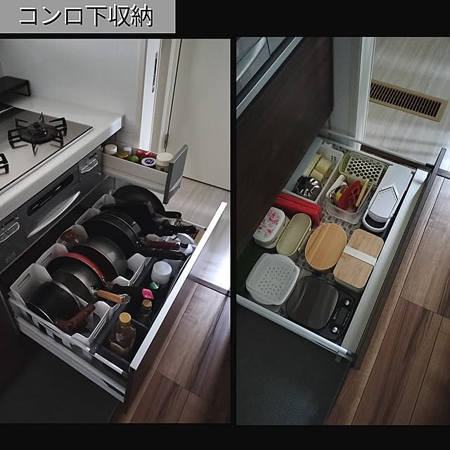 コンロ下の引き出しは、お料理の効率を左右する大切な場所。oco0.84.さんは、フライパンを立てて収納するだけでなく、その近くに調味料、下段にお弁当箱や調理グッズを……と、「どこで何を使うか」から逆算したベストポジションを整えています。まるでコックピットのように、必要なものがすべて手に届く範囲に。重ねず並べることで、調理中も片手でサッと取り出せます。この引き出しの中の工夫があるからこそ、ワークトップを広く保てるのですね。
