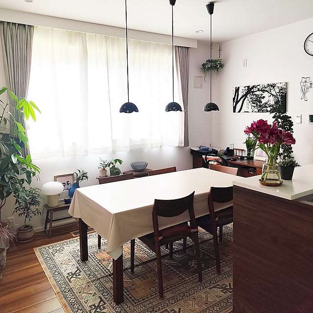やわらかな光が差し込むcoco0.84.さんのお家。お気に入りのアートやグリーンがバランスよく配置され、まるでお店のような穏やかな空気が流れています。でも、暮らしにはどうしても「生活感」が出るものがつきもの。coco0.84.さんは、「よく使うものはカゴやボックスに入れ、布を掛けて目隠しする」というルールで、目に入る情報のノイズを上手にカットされています。