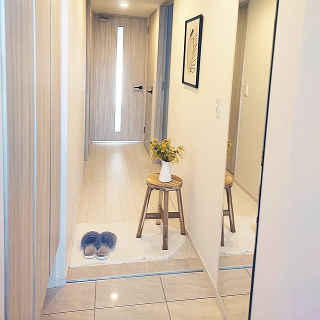 「家の顔」である玄関にも、wisteriaさんらしい光の使い方が光ります。清潔感のあるホワイトタイルの床に、木の温もりを感じるスツール。そこに飾られたミモザの鮮やかな黄色が、白い空間に春の訪れを告げます。ここでも鏡の映り込みが計算されています。スツール上のディスプレイを鏡越しに見せることで、狭くなりがちな玄関ホールを明るく、豊かな表情へと変えています。