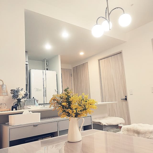 一歩足を踏み入れると、パッと目の前が明るくなるような心地よさに包まれます。wisteriaさんがお部屋作りで大切にされているのは、ベースカラーの「白」と、そこに重ねる「光」のバランスです。壁や家具、さらには家電まで白で揃えることで、空間の境界線がふんわりと曖昧になり、視線が奥まで抜けていくような効果が生まれています。また、部屋の角にある間接照明が天井に向かって光を逃がすことで、お部屋全体に柔らかな立体感がプラス。この白と光の相乗効果が、リビングをよりのびのびとした印象に見せてくれています。