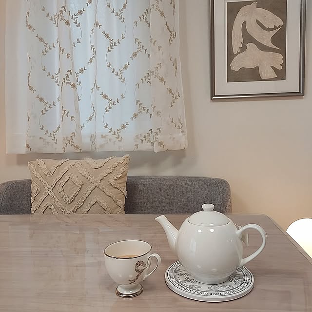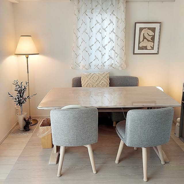 リビングダイニングのスペースでは、グレーのチェアと木の脚の組み合わせが、空間を優しく引き締めています。壁に飾られた控えめなアートや、植物をモチーフにした繊細なカーテンの柄。これら「有機的なライン」を取り入れることで、モダンな中にも心地よいリズムが生まれています。