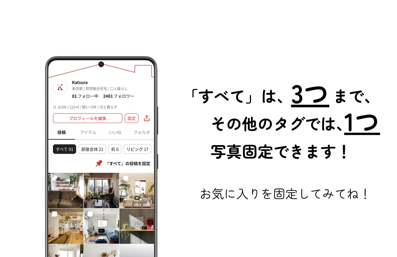 タグごとにお気に入りの投稿が固定できます。「すべて」では3枚、その他の「部屋全体」や「リビング」などでは、1枚設定できます!