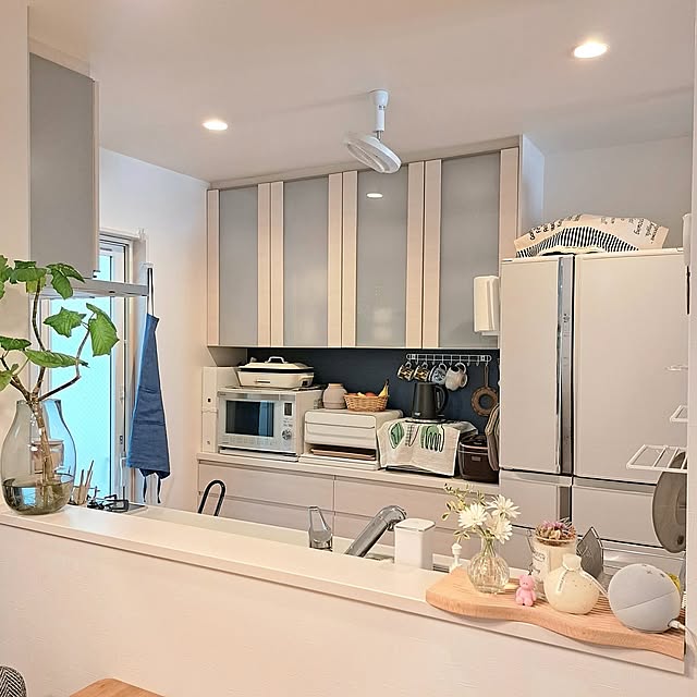Jijiさんのお宅は、柔らかな光が差し込むリビングや、清々しい空気感に包まれたキッチンがとても印象的。木の質感を活かしたインテリアと、バランスよく配置されたグリーンが、空間を優しく彩っています。利便性を追求しながらも、インテリアの柔らかな雰囲気を損なわない。そんな丁寧で自然体な暮らしのスタンスが、お部屋の端々から伝わってきます。