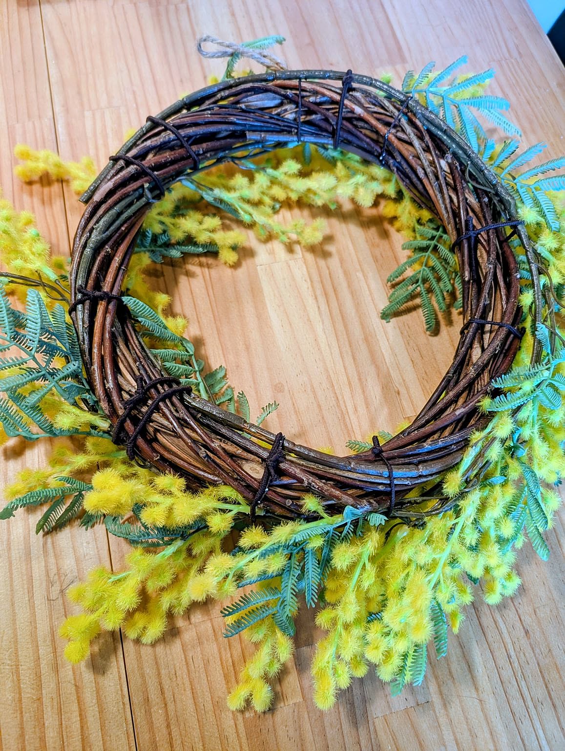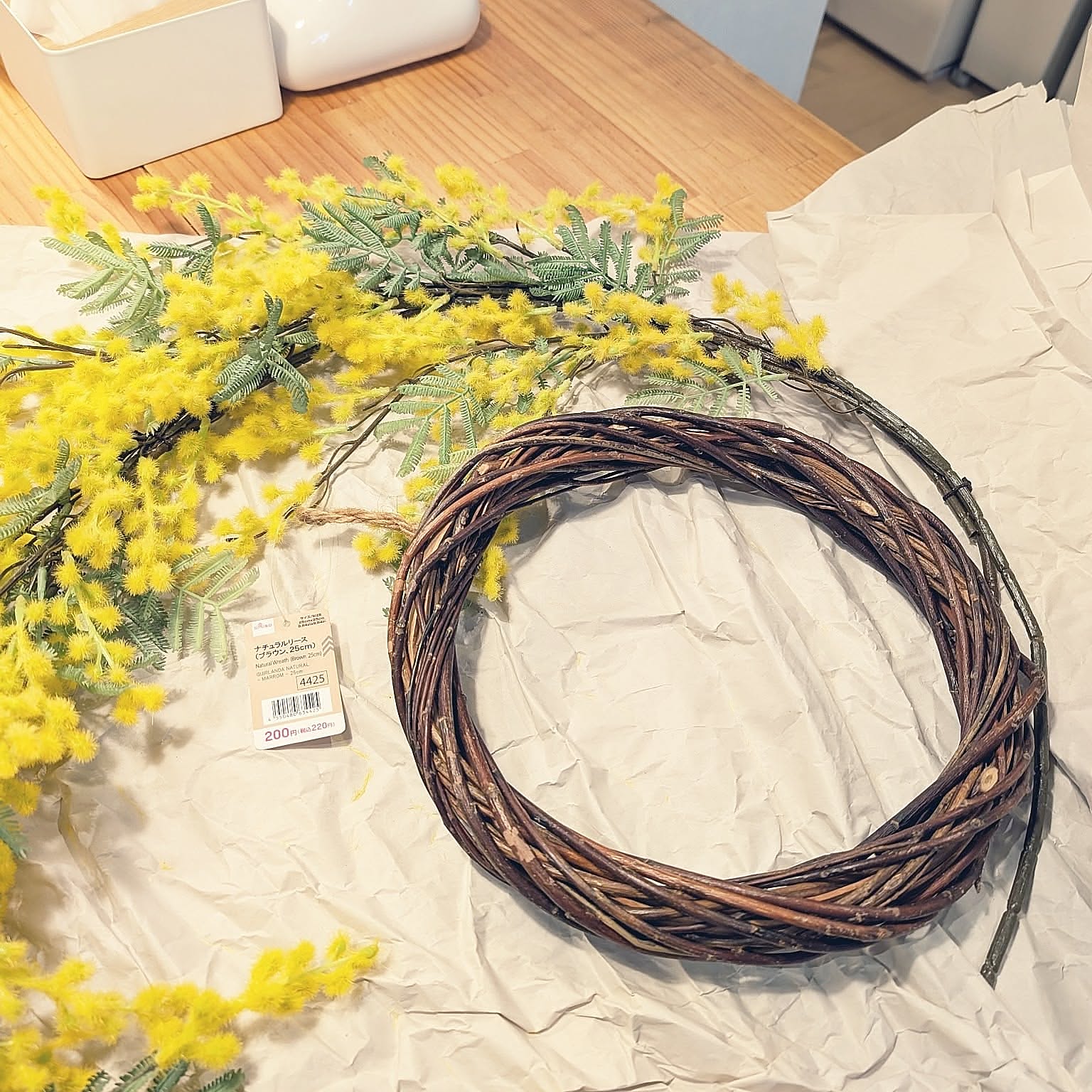 ご家庭にあるフェイクフラワーやグリーンを、100均で購入したリースベースに添わせます。