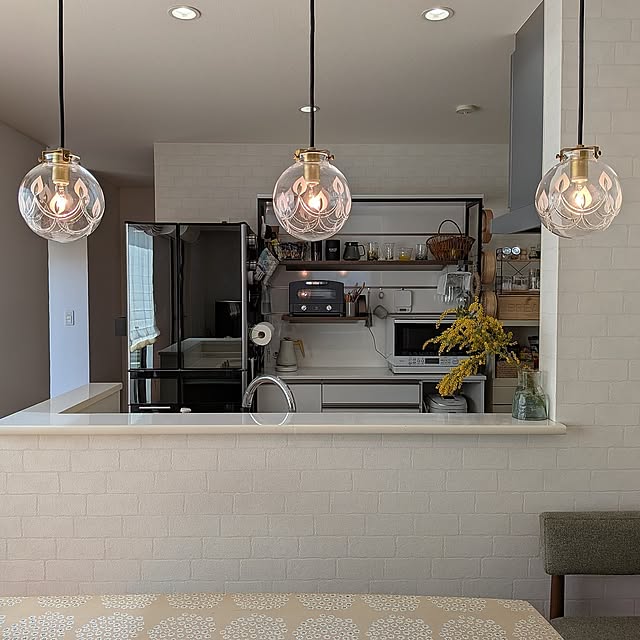 kumijiさんのお住まいにまず感じるのは、空気がさらりと流れるような「軽やかさ」です。その理由は、暮らしの中の「見え方」をとても大切にされているから。例えば、つい物があふれがちなリビング階段の下。kumijiさんはここに白いカーテンを設置し、サッと引くだけで中を隠せるように工夫されています。一方で、梁にドライフラワーを吊るしたり、キッチンカウンターに繊細なガラスのランプを取り入れたりと、ときめくポイントにはあえて「見せる」楽しみを。引き算で整えられた空間だからこそ、お気に入りのひとつひとつがオブジェのように際立ち、毎日に心地よいリズムを運んでくれます。