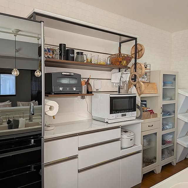 キッチン周りは、kumijiさんの「隠す・見せる」のバランス感覚が一段と光る場所です。大型家電は白やモノトーンで統一して、壁や家具に溶け込む「背景」のように。その分、オープン棚にはカゴやコーヒー器具を並べて、飾る時間を楽しまれています。収納力とデザイン性を兼ね備えたキャビネットも活用し、すっきり整っているのにどこか温もりのあるキッチンをつくり上げられました。