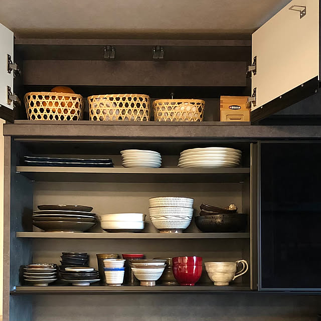 「食器棚の左半分には普段使いの和食器達を。上置き棚には使用頻度の低いお皿や金継ぎ待ちの子達が眠っています。大好きな小石原焼を少しずつ集めています!」