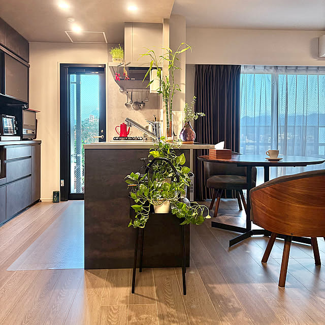 お部屋を見渡すと、アイビーやミリオンバンブーが生き生きと並ぶ開放的なキッチンが目に飛び込んできます。ペニンシュラ型の良さを活かし、お部屋全体へと視線がシームレスに繋がる開放的なつくり。キッチンカウンターの上など、自然と緑が目に入る配置は、家事の合間にふと心を緩めてくれる大切なエッセンスとなっています。ステンレスのクールな表情に、植物のしなやかなシルエットが重なることで、空間全体が穏やかなリズムに包まれていますね。