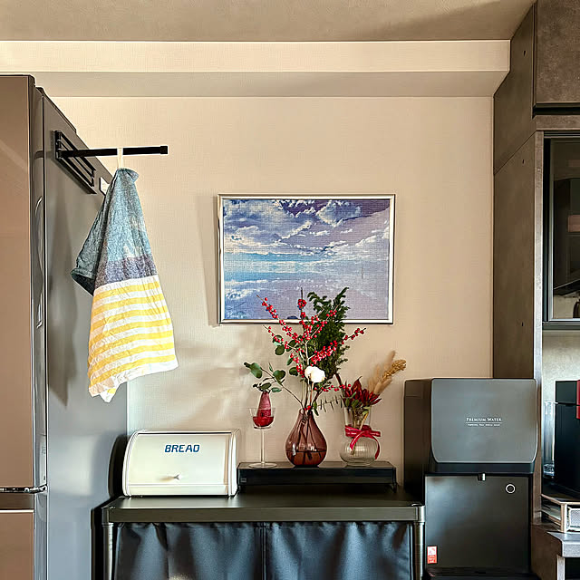 キッチンの背面の壁に飾られているのは、up0524さんが時間をかけて完成させたというジグソーパズルです。ウユニ塩湖の爽やかなブルーと白のコントラストが、モノトーンを基調としたキッチンに心地よいエッセンスを添えています。既製品を飾るのとはまた違う、自分の手を動かした「過程」があるからこそ、この一枚は空間に温かなストーリーを運んでくれ、キッチンをより愛着のわく場所にしてくれますね。