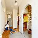 旦那、私、子供2人の4人家族。 北欧雑貨、北欧カラーが大好き。 30坪の小さな空間ですが、充実した間取り。 土間収納、キッチン周りの作業スペース、子供部屋の造作勉強机、アーチ垂れ壁クローゼットがポイント! 滋賀・華建築・hanaken
