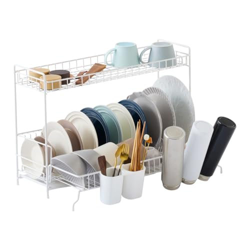 アール SAKuRAKu 水切りラック 2段 (ホワイトグレー) スライド伸縮 ネジも工具もいらない 簡単組立て (幅約19.5~32.9cm×奥行約57.5cm×高さ約38.5cm) カトラリーケース付き 水が自動排水できるトレー付き JIN-521