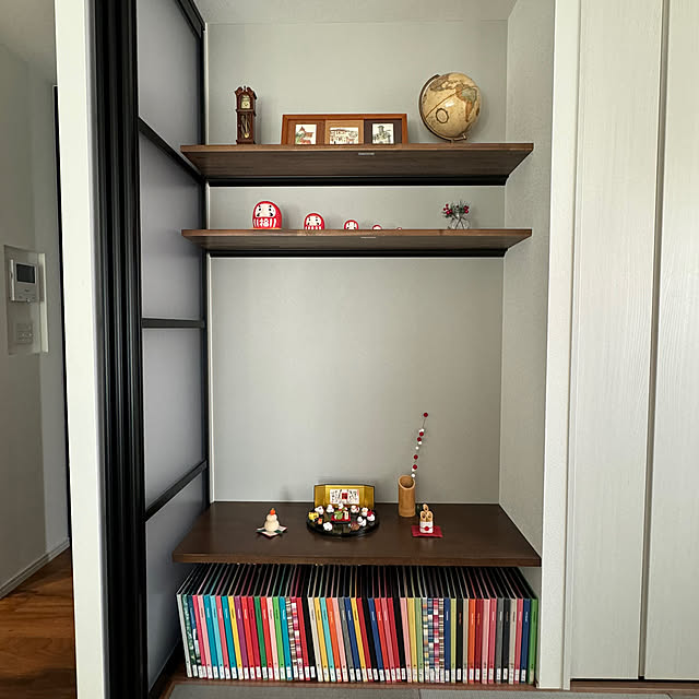 お正月インテリア2024🎍和室の造作棚。上から2段目に飾るものがなくて、雑貨屋さん行ってきました。何店か回ったけどいいのがなくて、半ば諦め気味でロフトに行ったら…ありました‼️🙌だるまさんのはりこーシカが‼️これの鯉のぼりバージョンも持ってます🎏横に並べればスペース的にいい感じ🎵ありがとう、ロフト✨✨✨はりこーシカの横には、以前セリアで買ったフェイクの南天を飾っています。2枚目はアングル違いで。3枚目はその下のディスプレイ。4枚目は造作棚全体です。1番上のポストカードは、冬のものがなかったので、神戸異人館の優しいタッチのポストカードを飾りました。